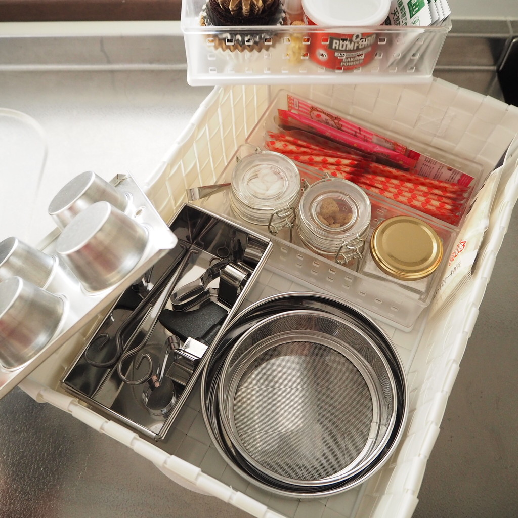製菓用品はこんなたいしたもの作らない私でもこの量持っていて2段で収納しています