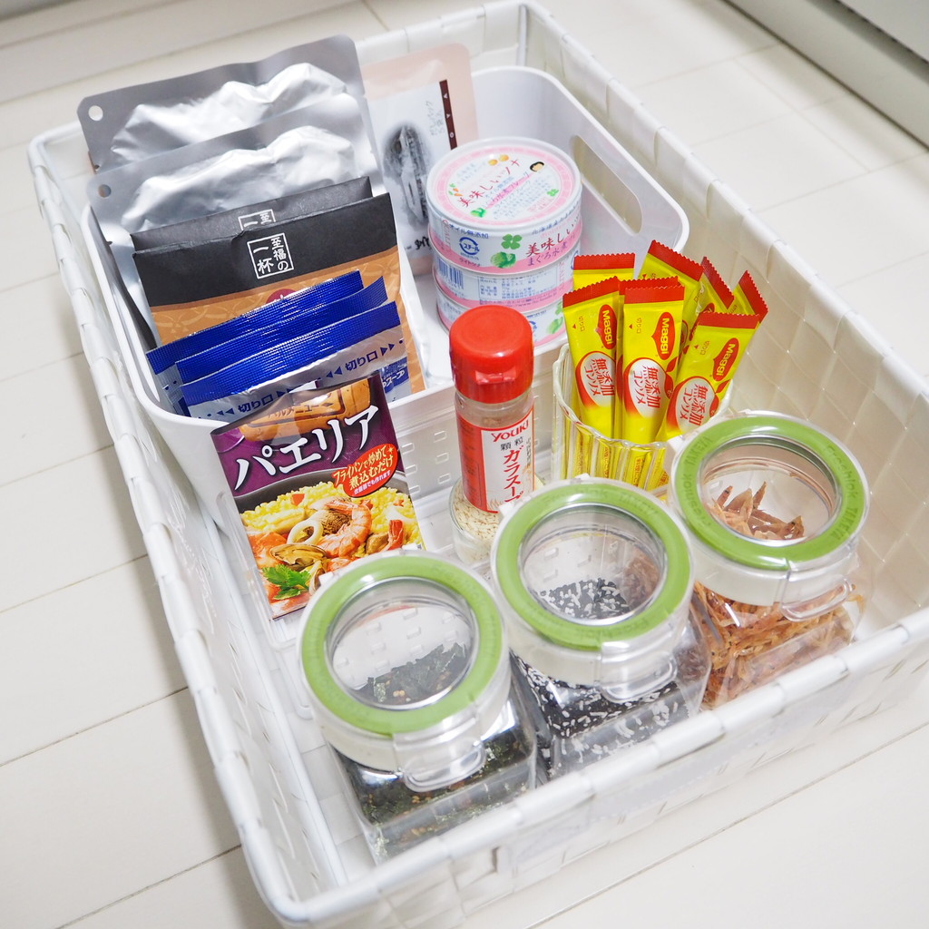 頻繁に使う調味料や乾物類は吊り戸棚にまとめることができたので次はレトルト・缶詰などのストック品と製菓用品です