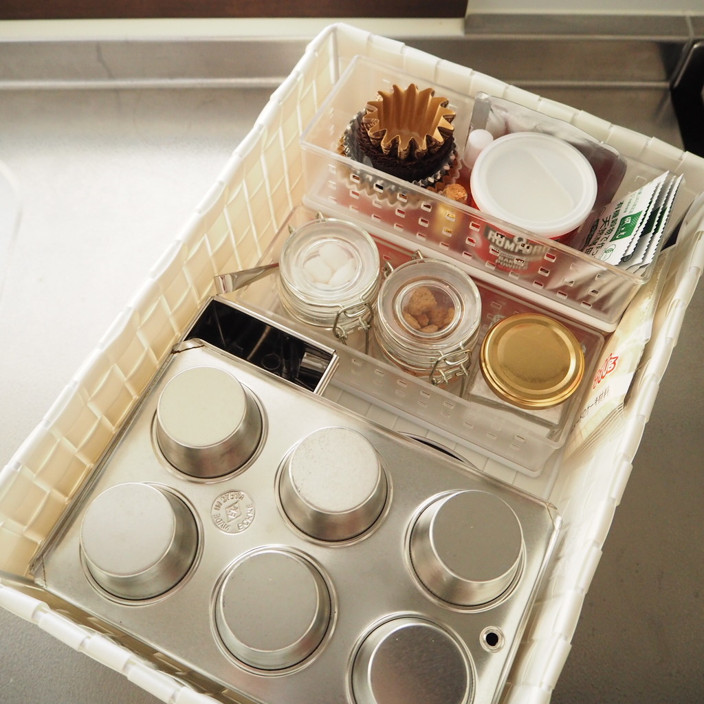 これらを使うときはカウンターの上にバスケットごと出して作業をし終わったらバスケットごと片付けます