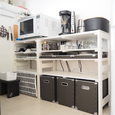 キッチンの壁側に置いてある食器棚件収納ラック