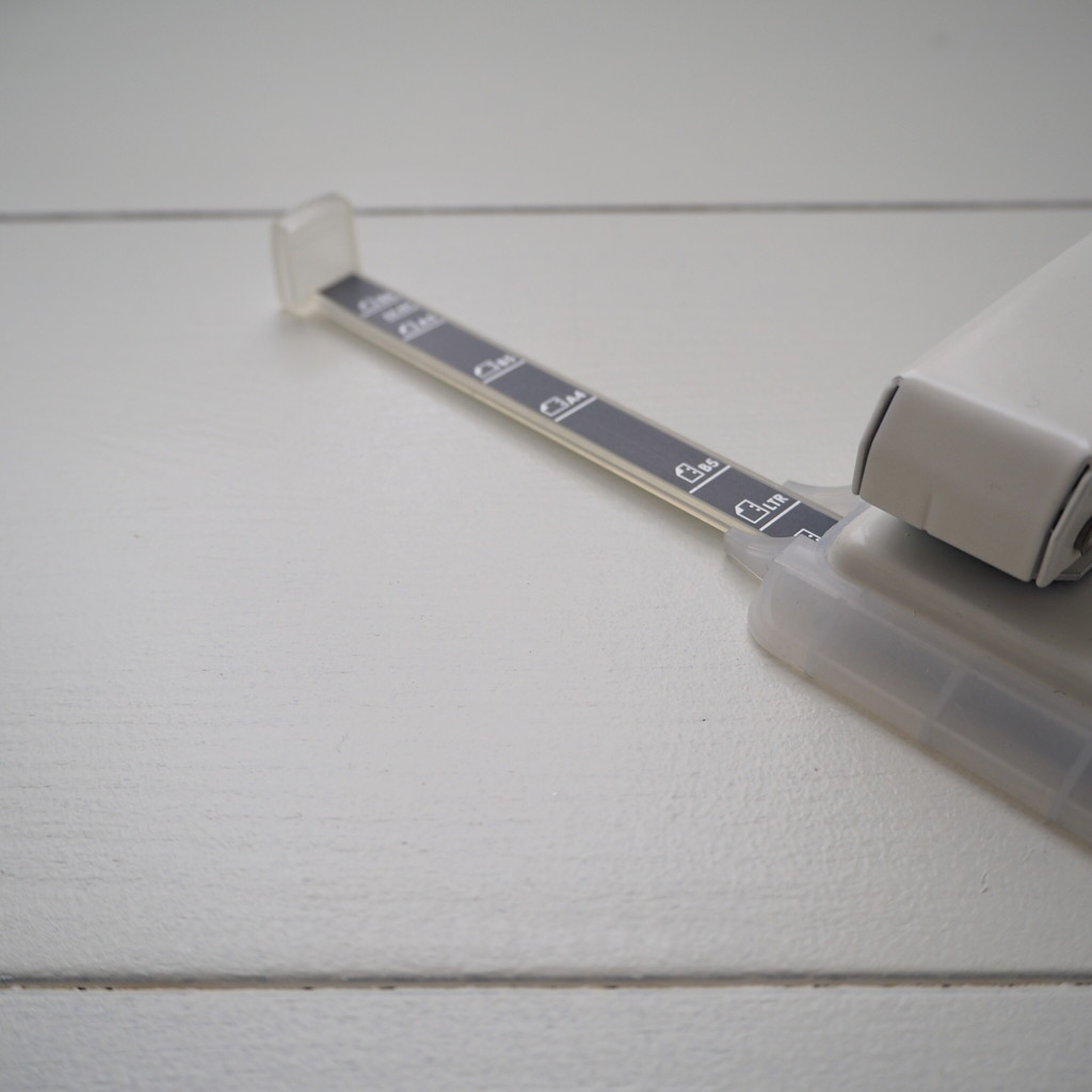 これがなかったら書類を半分に折って真ん中に印を付けそれをパンチの印に合わせて穴を開けるという作業になるところがこのゲージに合わせただけでベストな位置に穴を開けられます