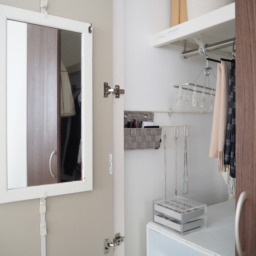 ついでにメイク用の鏡にぶら下げていたアクセサリーもベンチ入りしていたベルトハンガーを使ってこちらに移動
