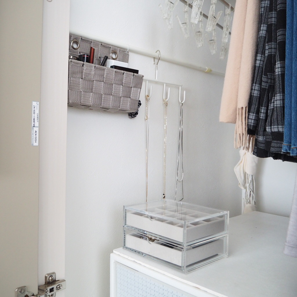 クローゼットのPPケースの上にトレーを乗せてその上にアクセサリーやメイク道具などをひとまとめにしていました