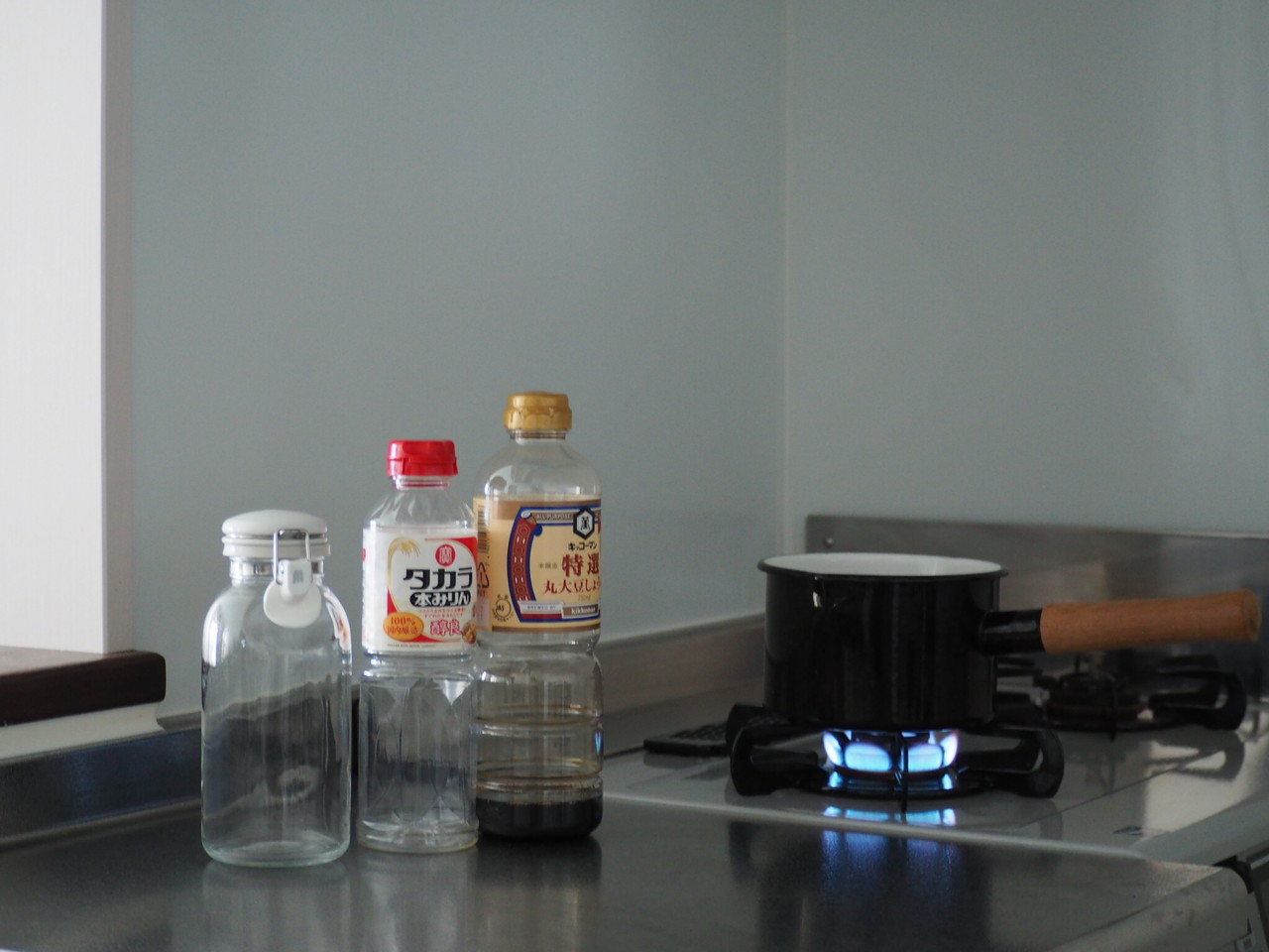 ①しょうゆとみりんを同量と昆布を鍋に入れる