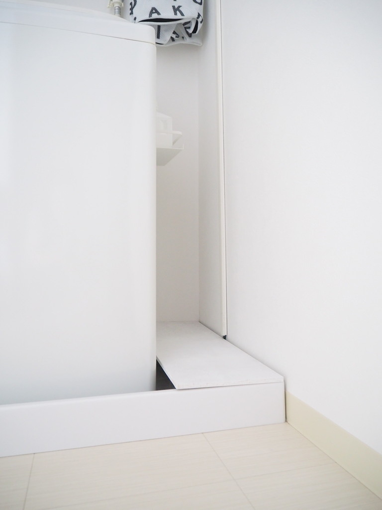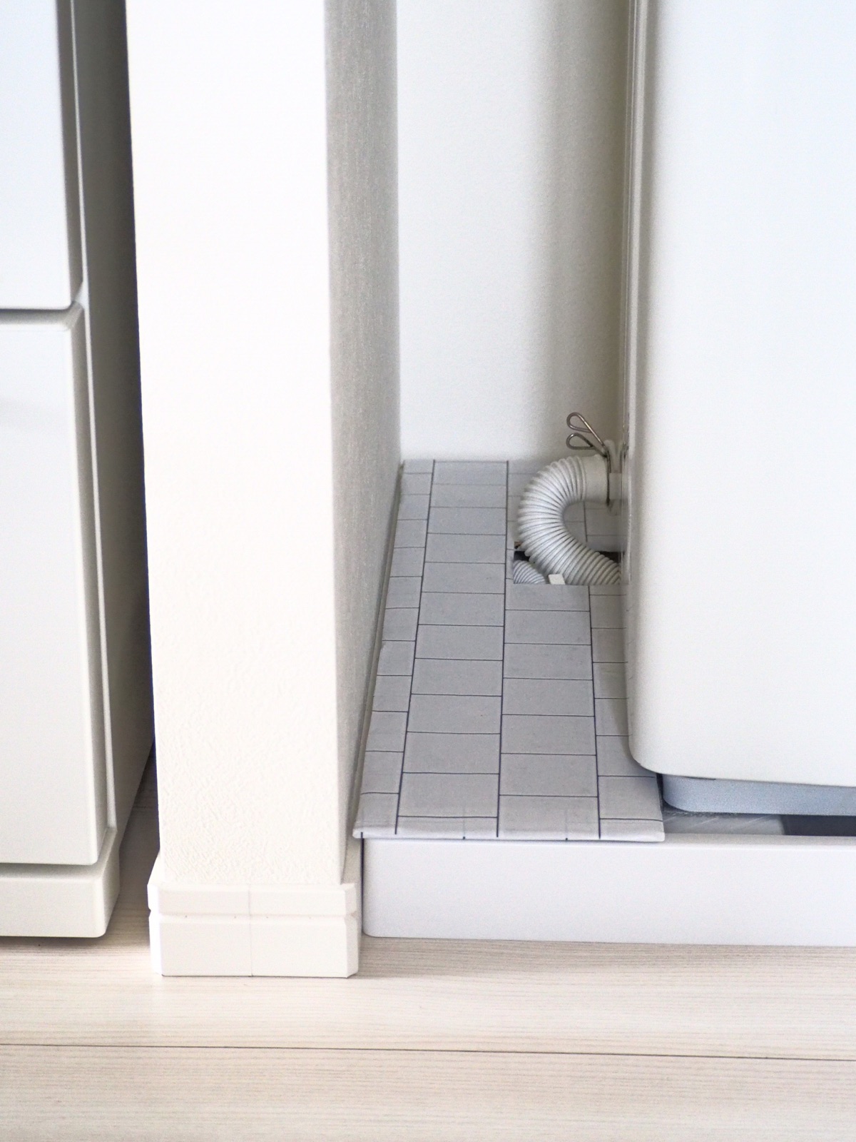 以前は洗濯機横のサイズに合わせてカットした板一枚を乗せるだけでよかったんだけど、あの段があるためにホースをよけなきゃいけなくて。