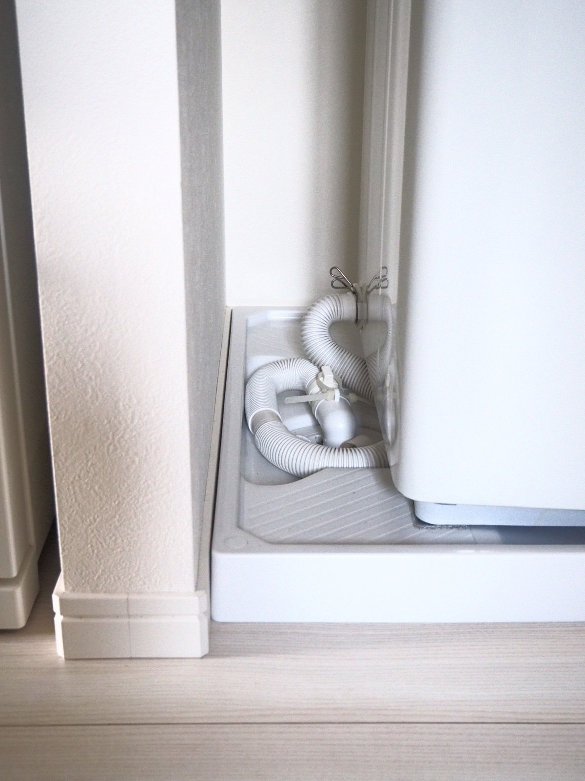 前の住まいの防水パンは浅くて広い”たらい状態”だったけど、今度は洗濯機の脚を乗せるところが高くなっているタイプ。