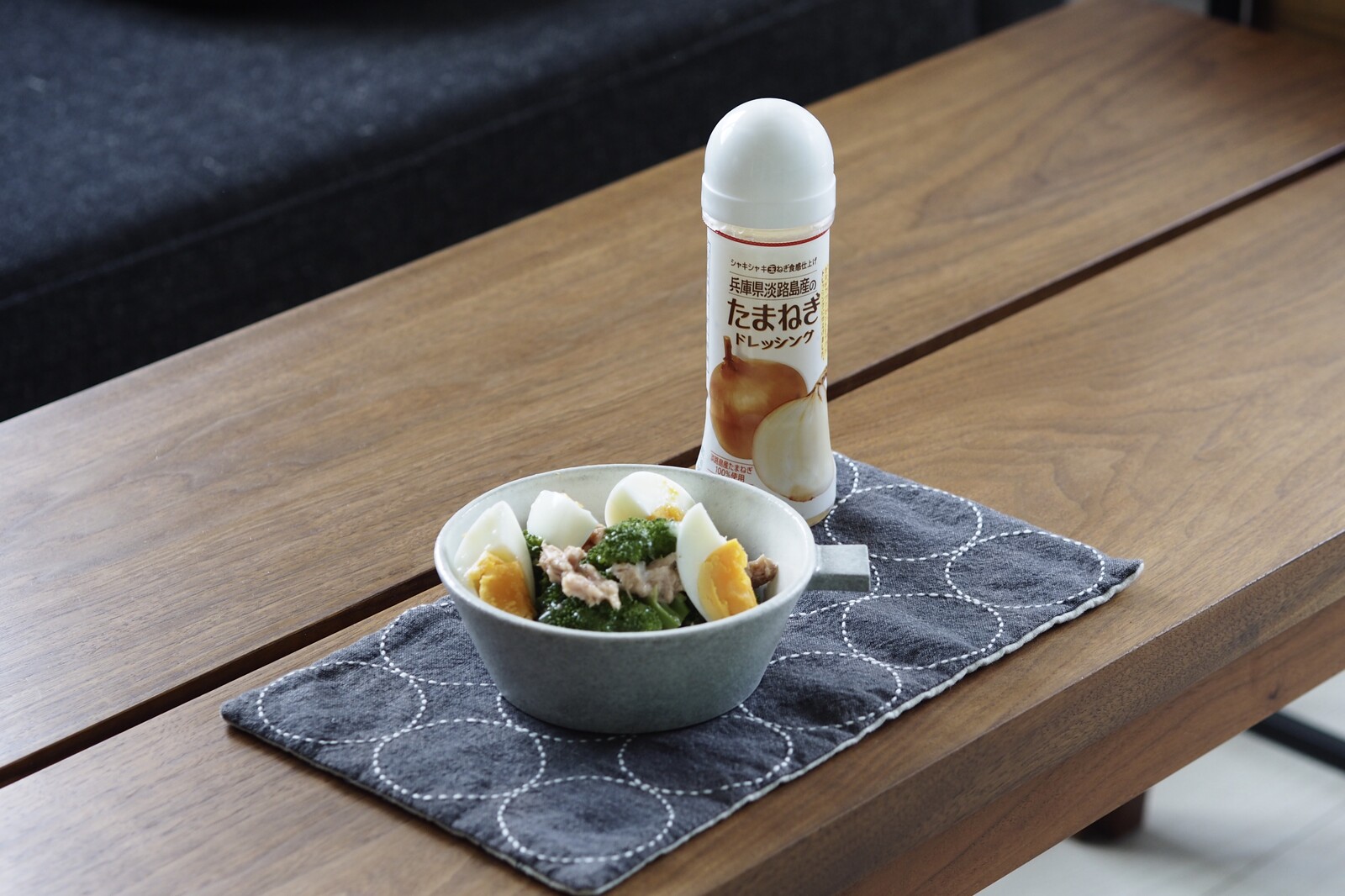 茹で卵とツナも乗せて、兵庫県淡路島産のたまねぎドレッシングでいただきました♩