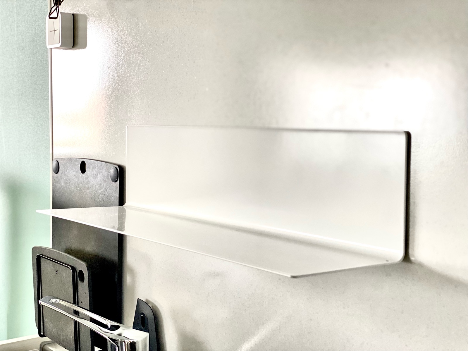 シャーペンで壁にうっすら印をつけ、棚の上側からそろーっとくっつけます。