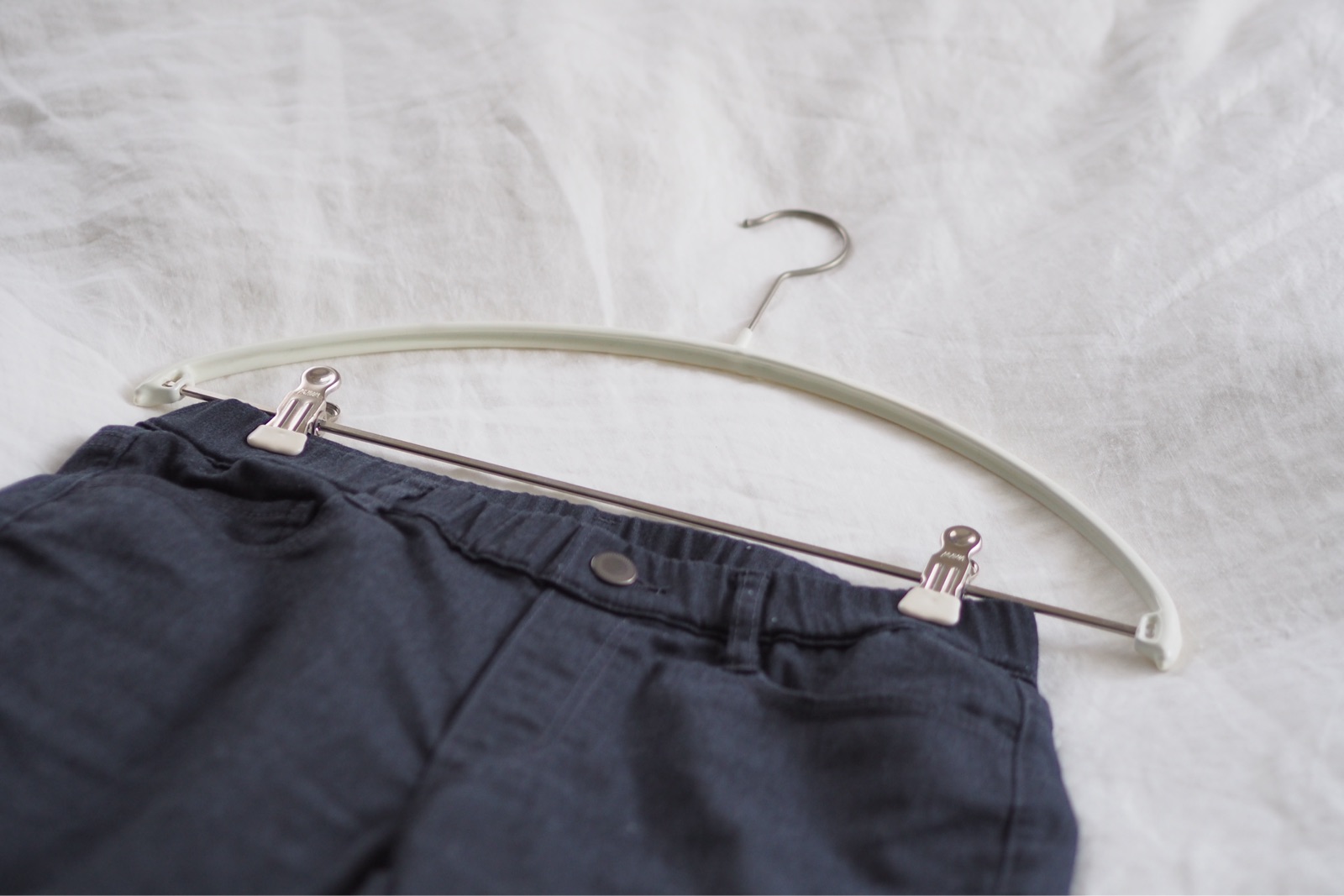 ピンチでパンツやスカートのウエストを挟み、ハンガー部分にはアウターなどをかける