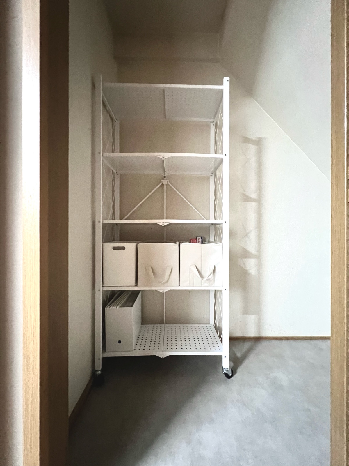 スチール製でしっかりした作りですが、キャスター付きなので、このまま階段下へスルスルと移動させられます。