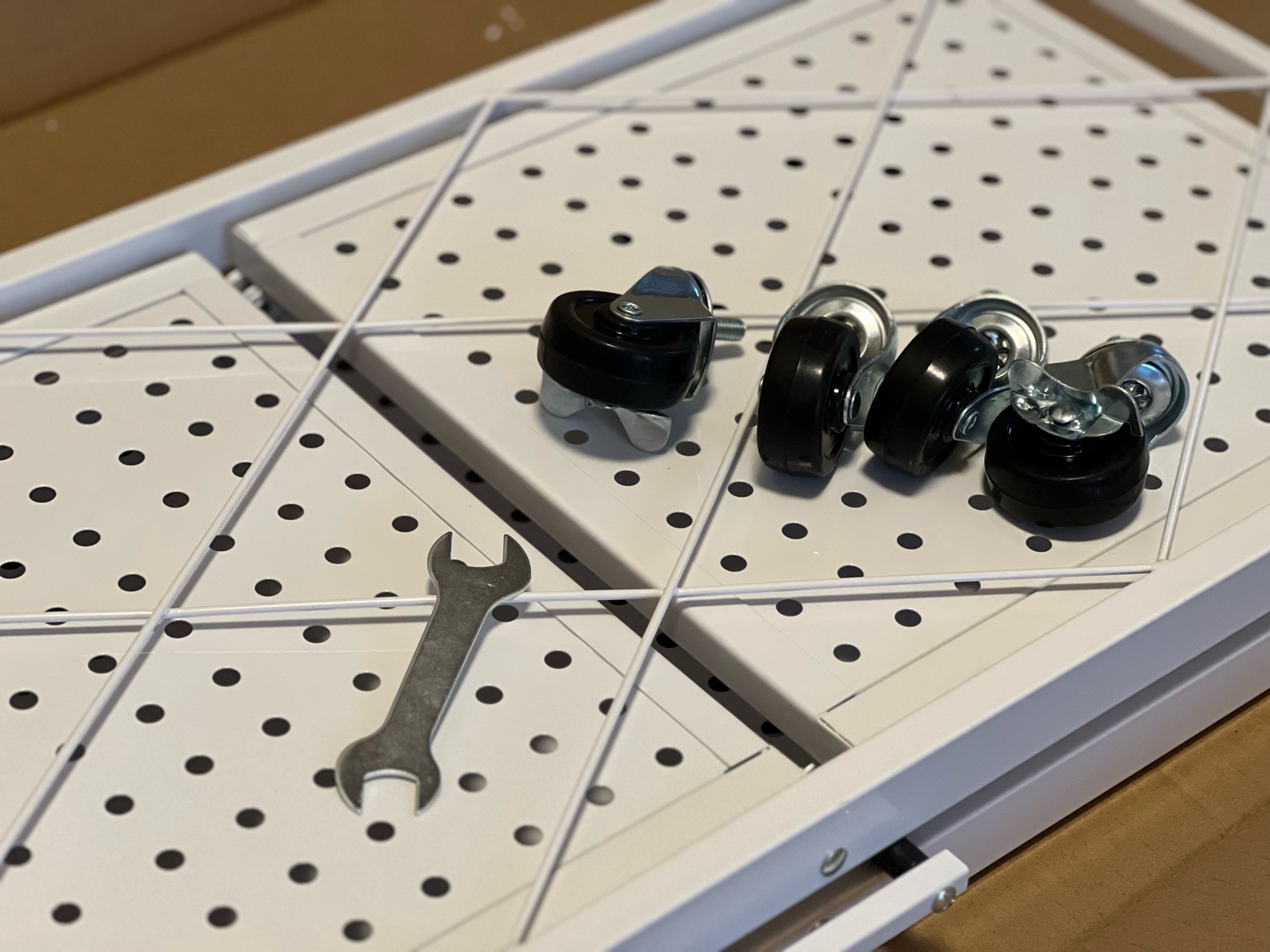 キャスターをくるくる回して取り付けたあと、立たせてパッと広げるだけで——