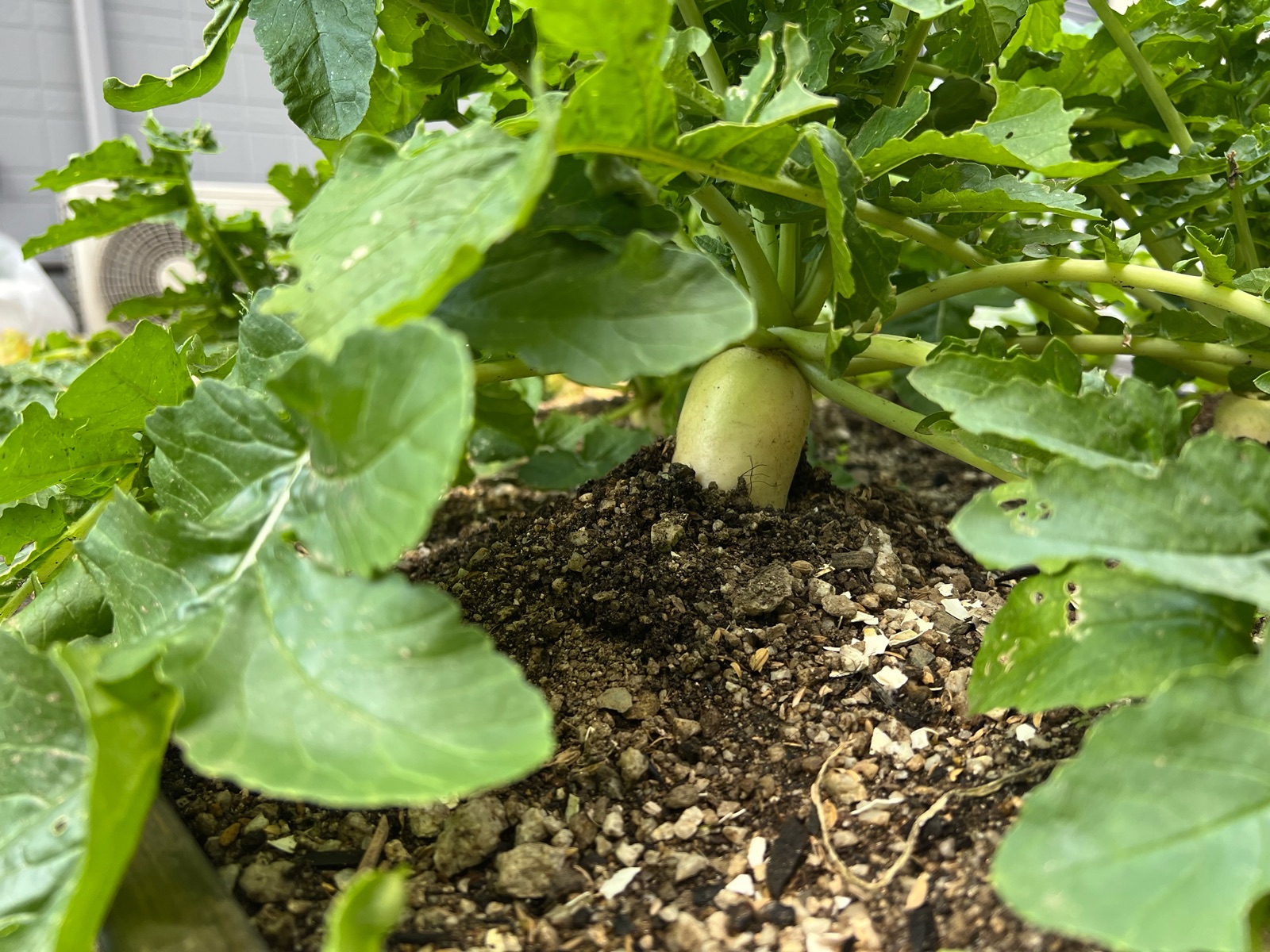 夏に植えた大根は、どうにかここまで育ったけれど、日陰が増えてから成長がゆっくりになりました。